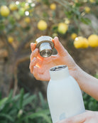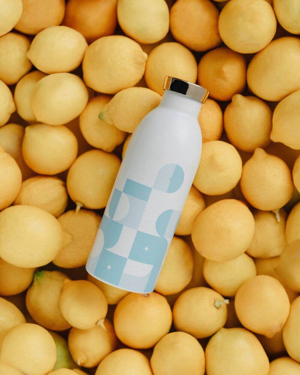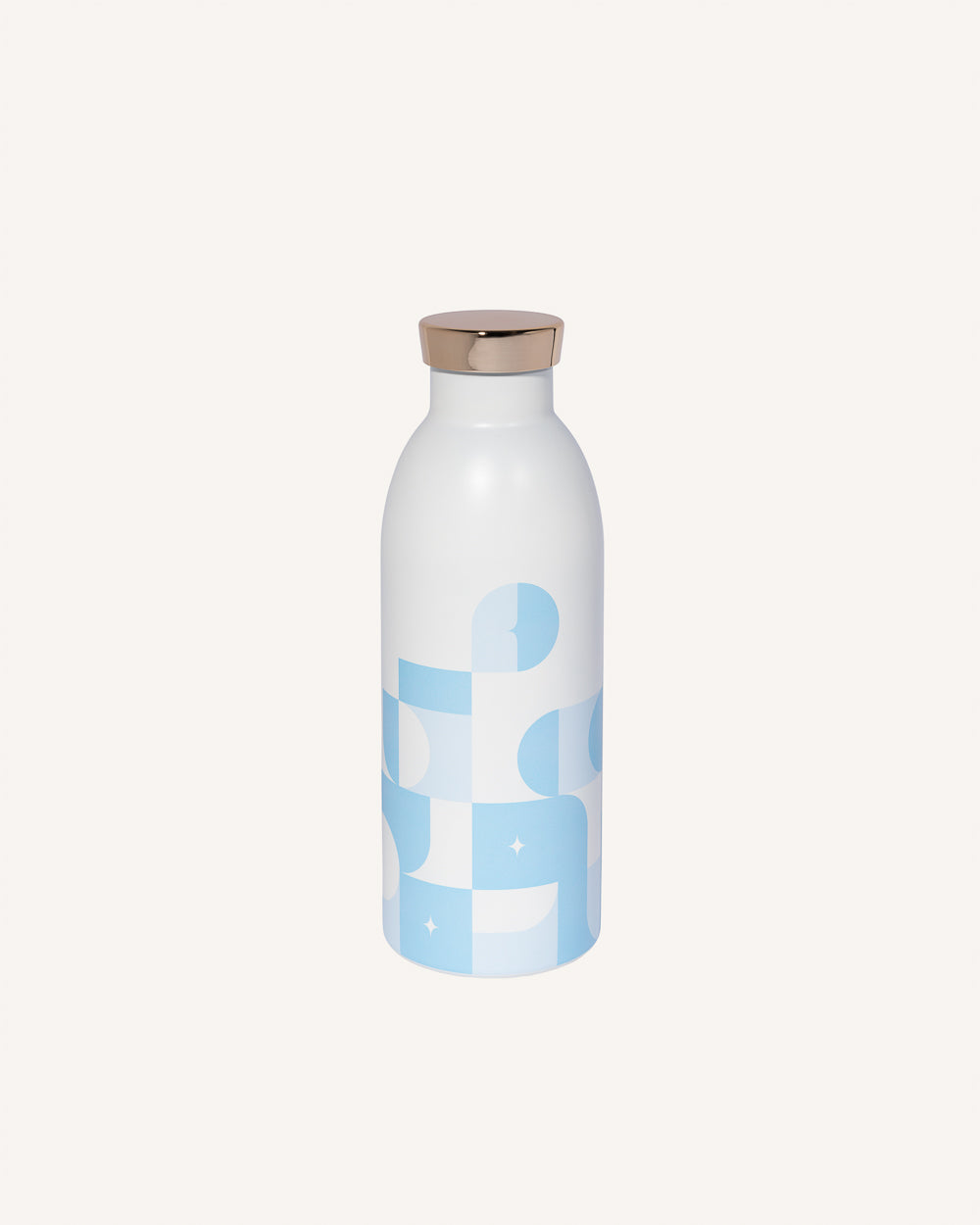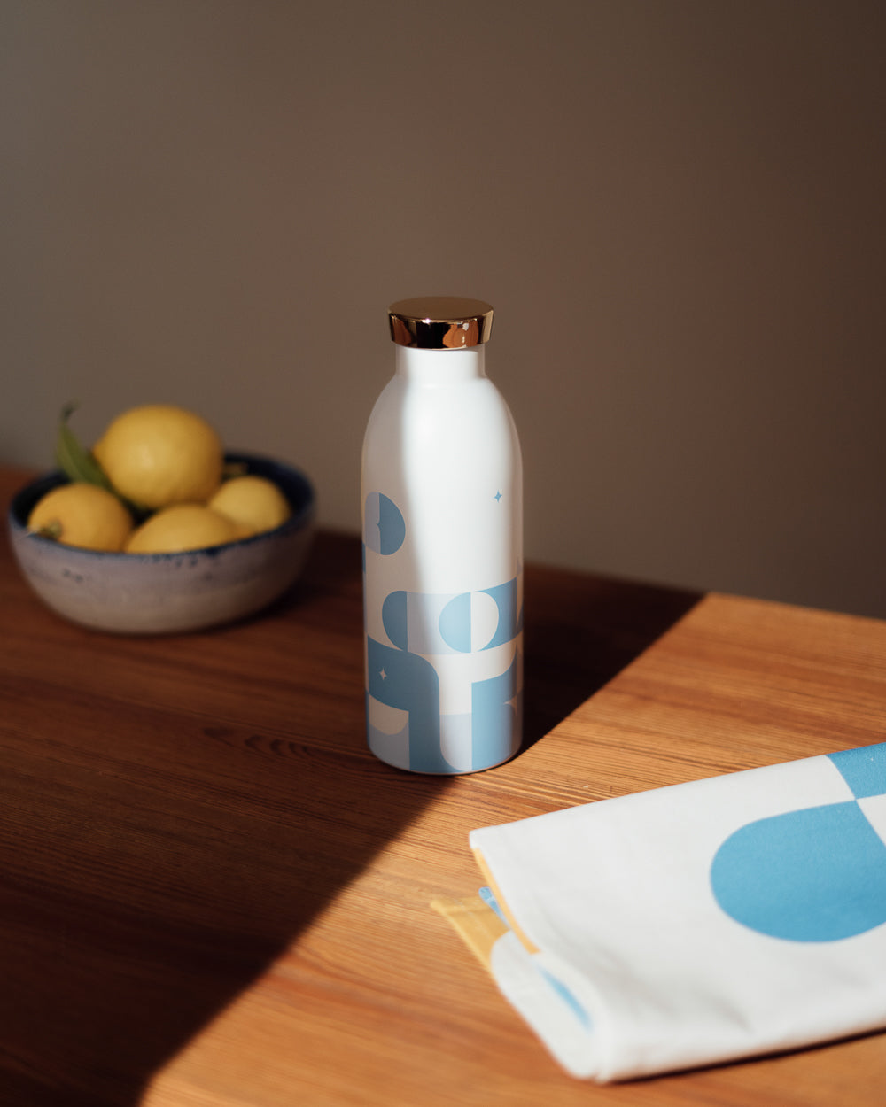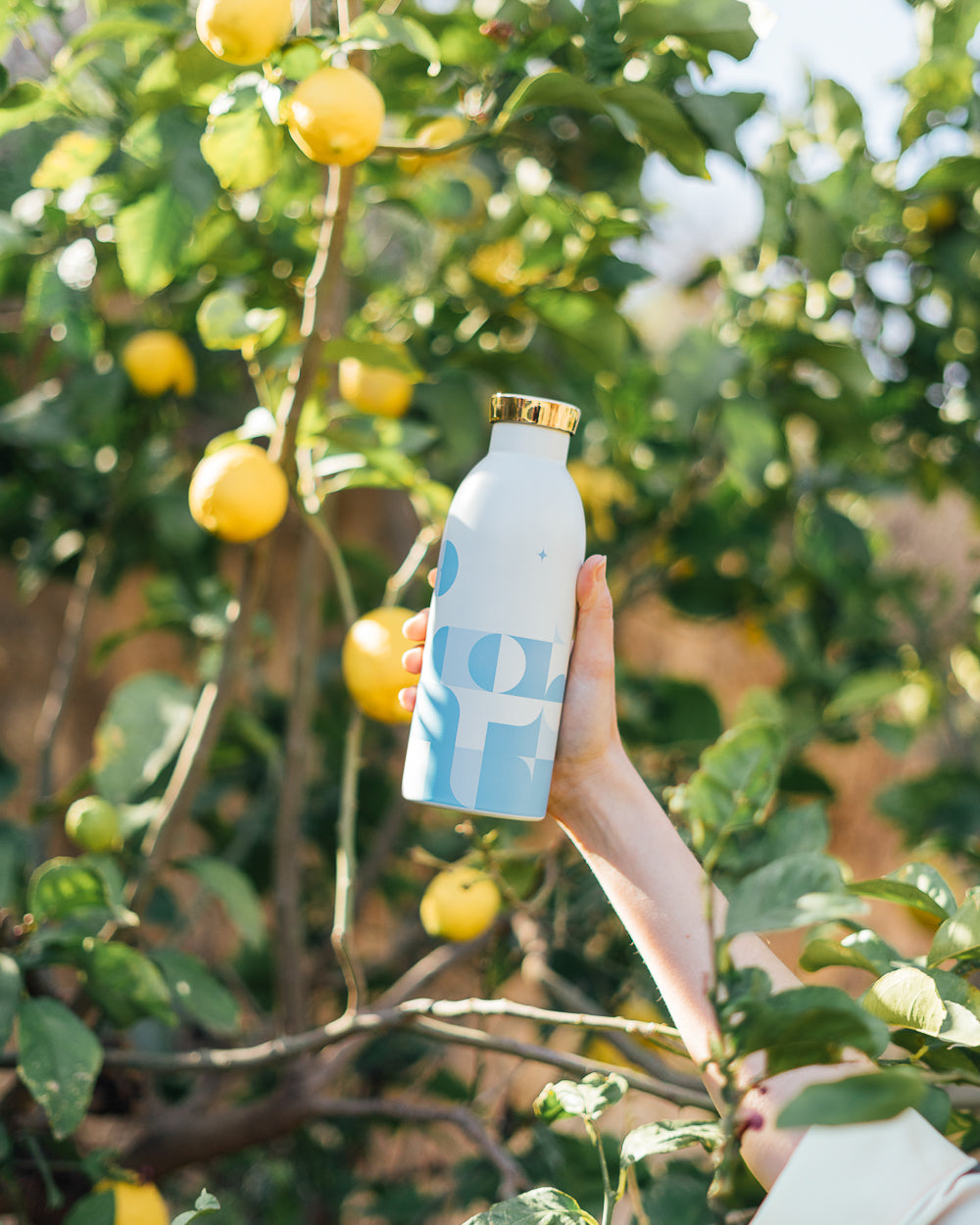 Botella de acero inoxidable de 500 ml de la colección Akalia, inspirada en el estilo de vida mediterráneo. Esta botella es perfecta para acompañarte cada día, manteniendo el agua fría 24 horas y el café calentito hasta 12 horas.