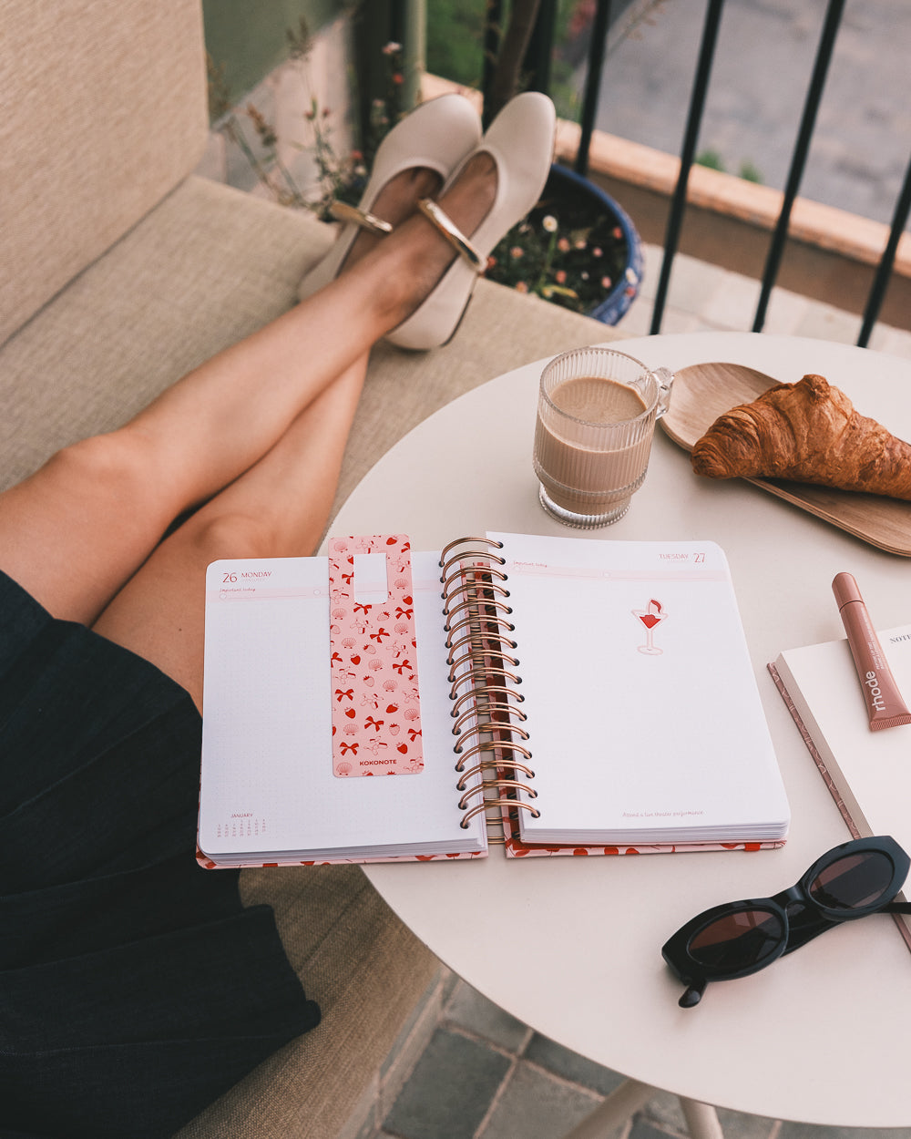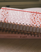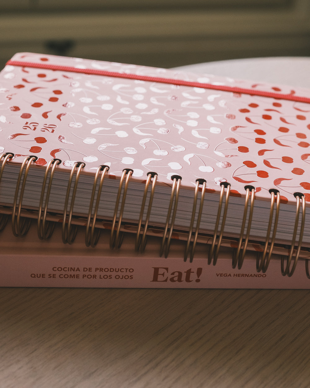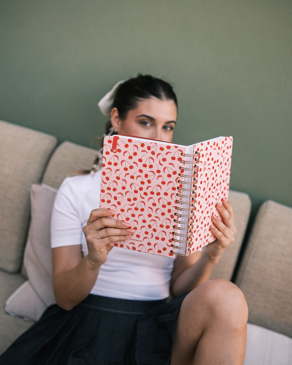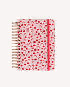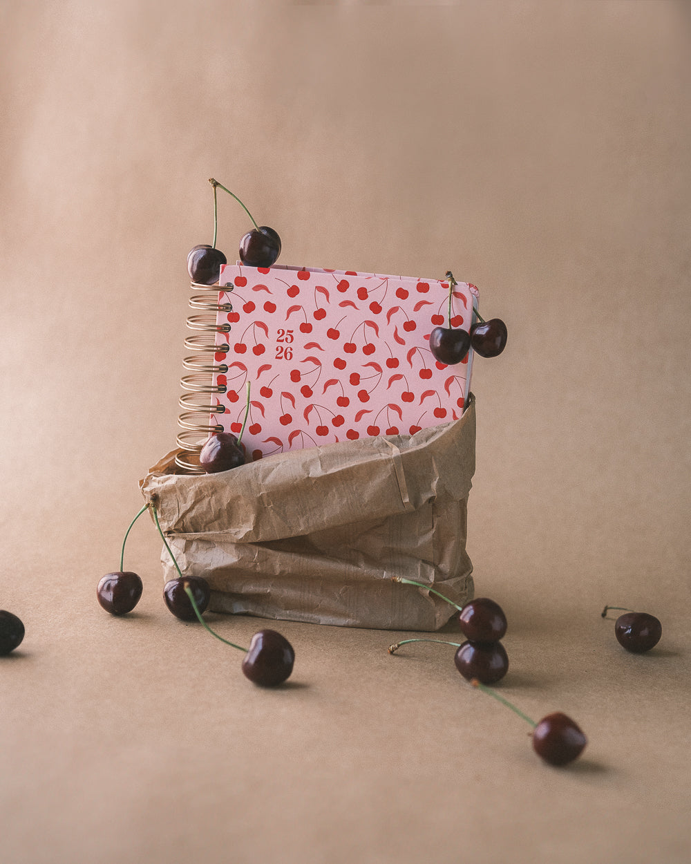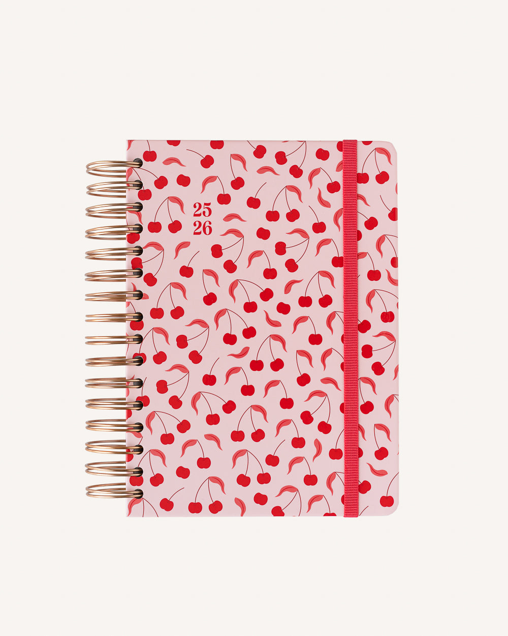 Agenda diaria coqueta con estampado de cerezas en rosa y rojo, planifica con un toque extra de dulzura.