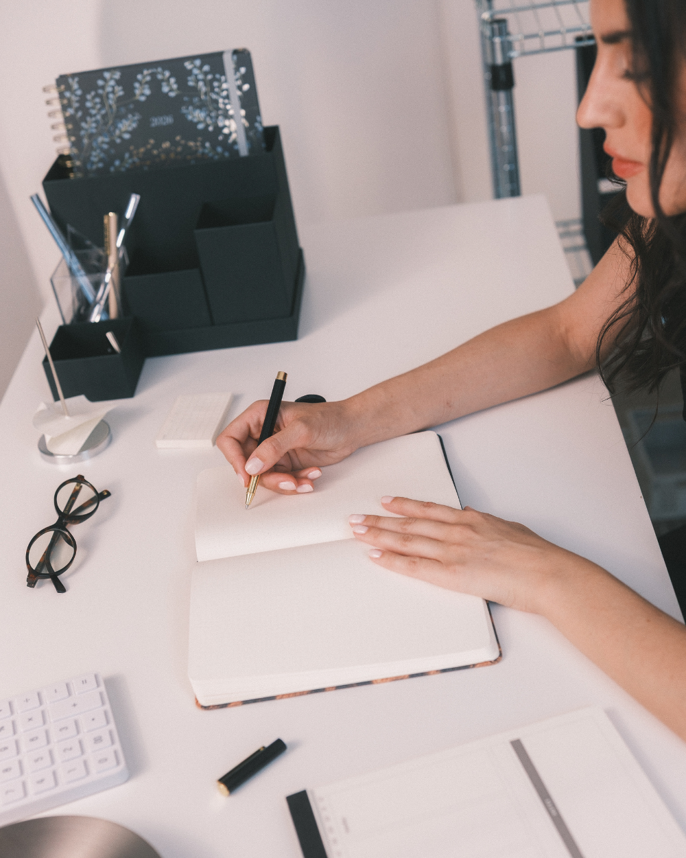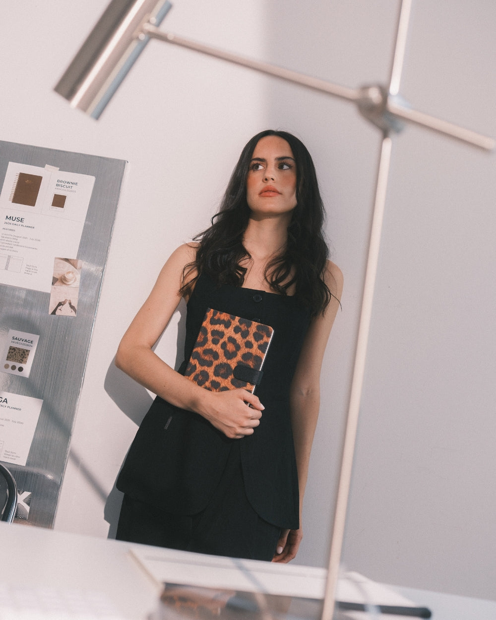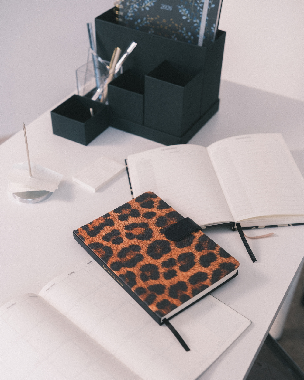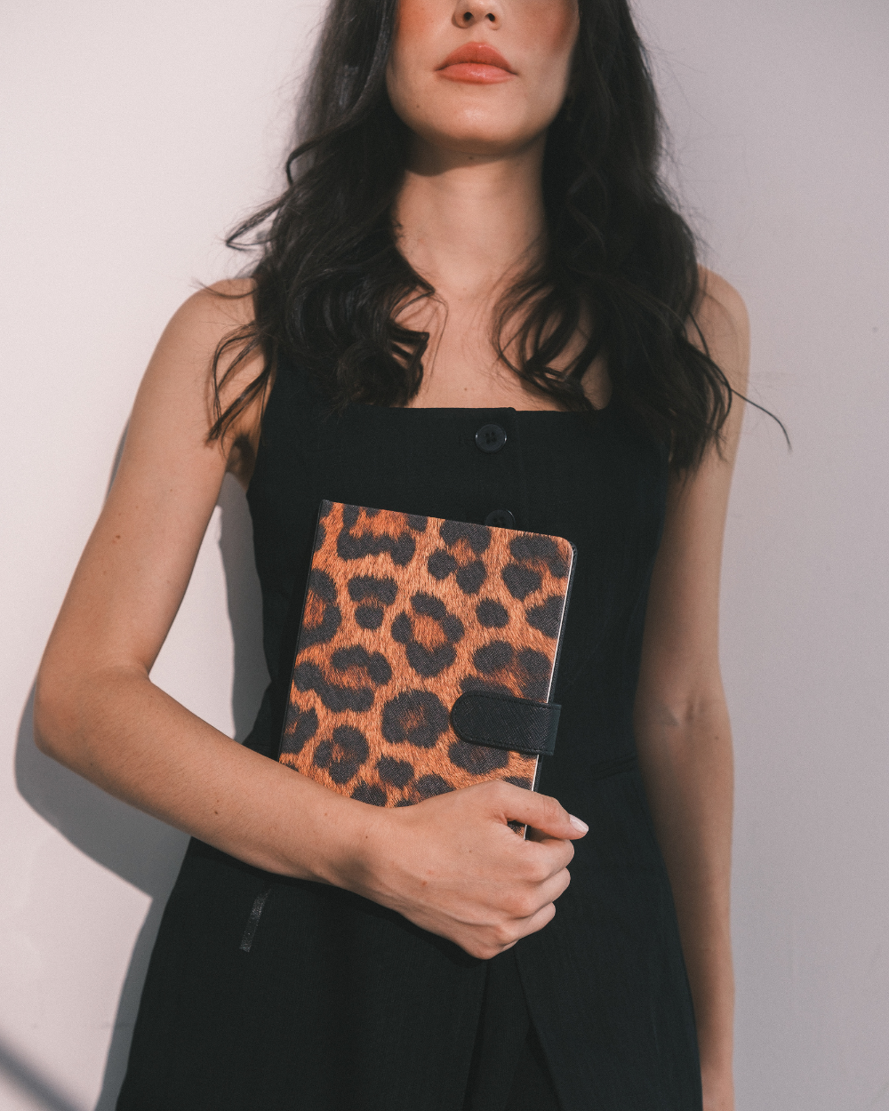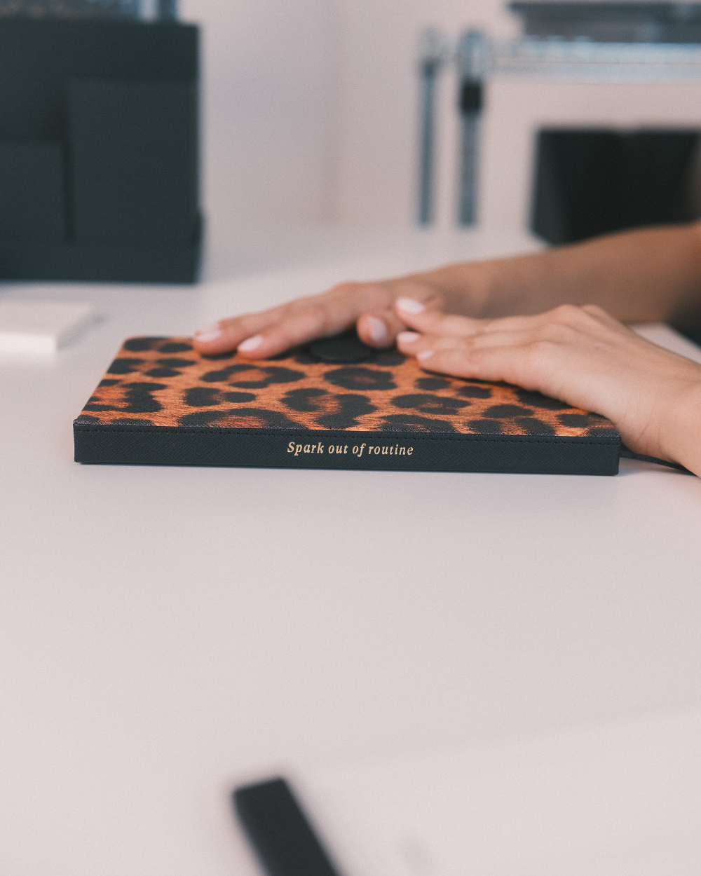 Elegant notebook with faux leather cover and exclusive leopard design with magnetic closure and black bookmark ribbon. Its binding allows for comfortable writing when fully opened and is ideal for organizing your ideas anywhere