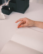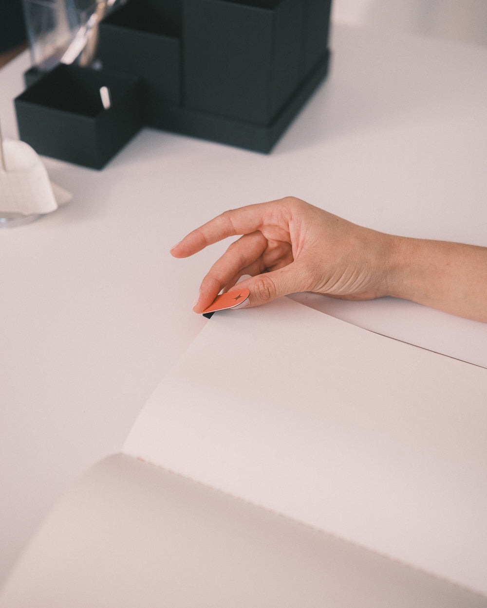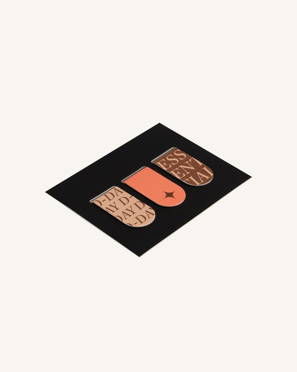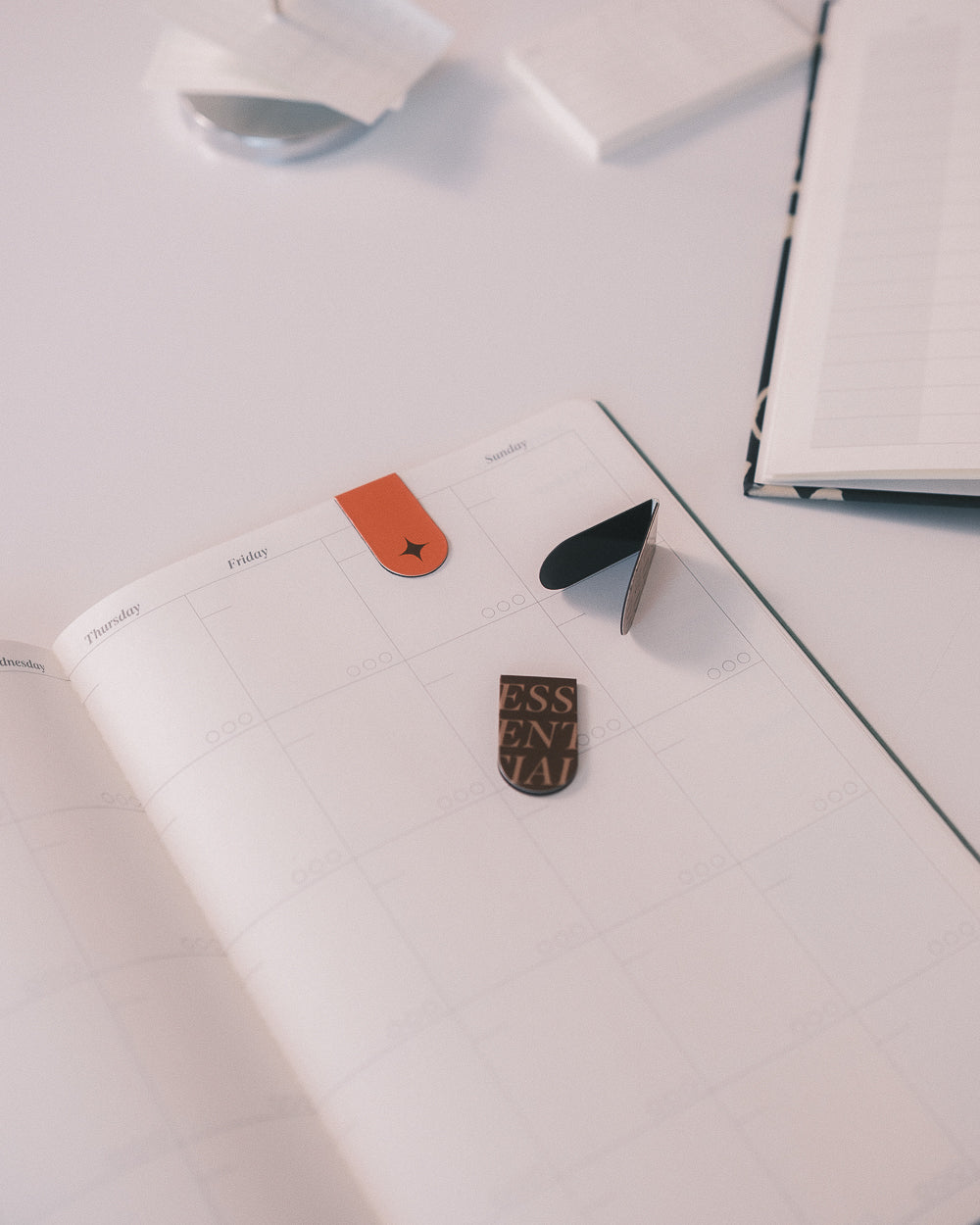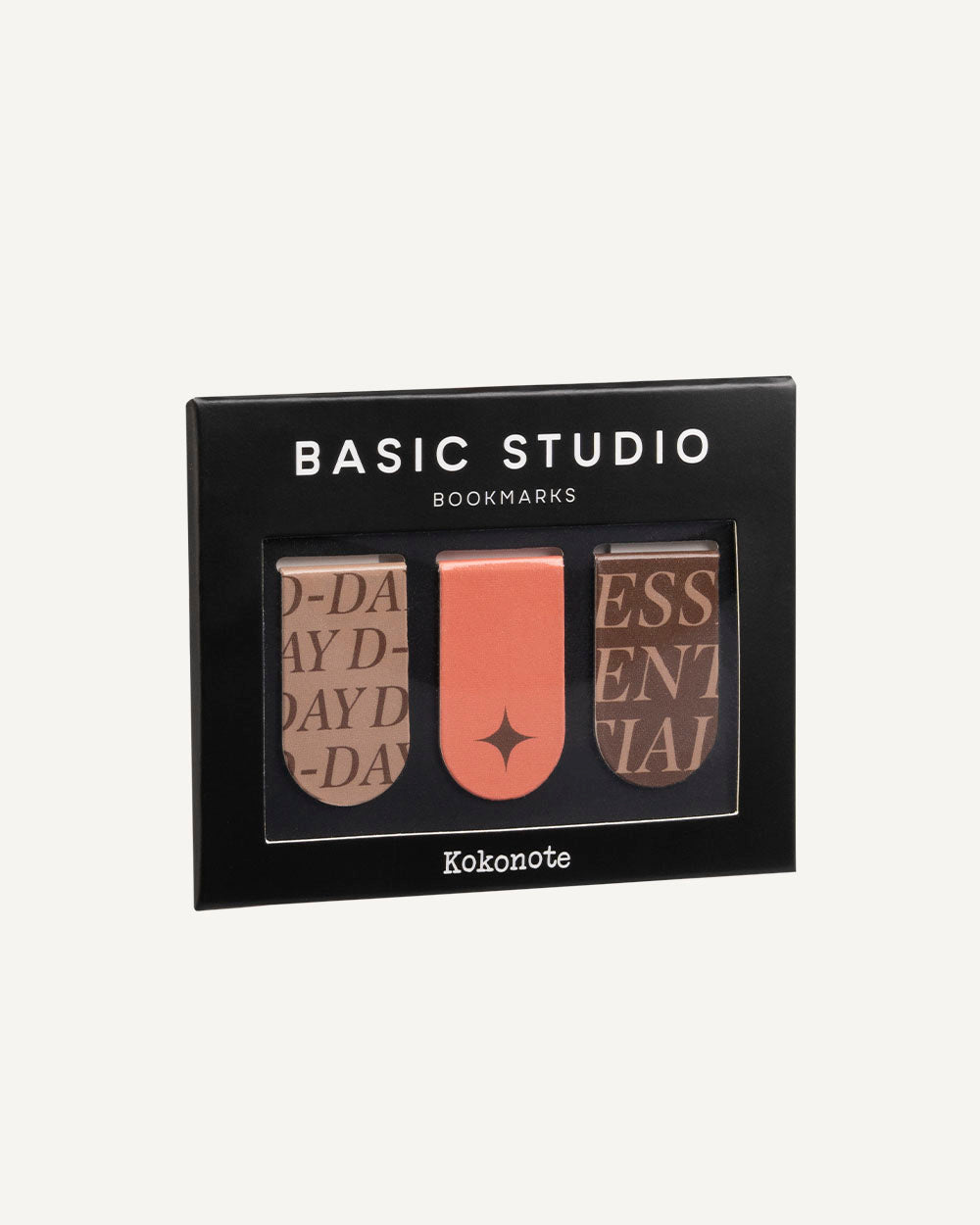 Set of three magnetic bookmarks with different designs in brown and coral pink.