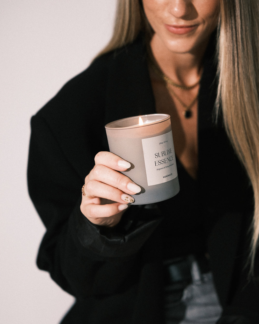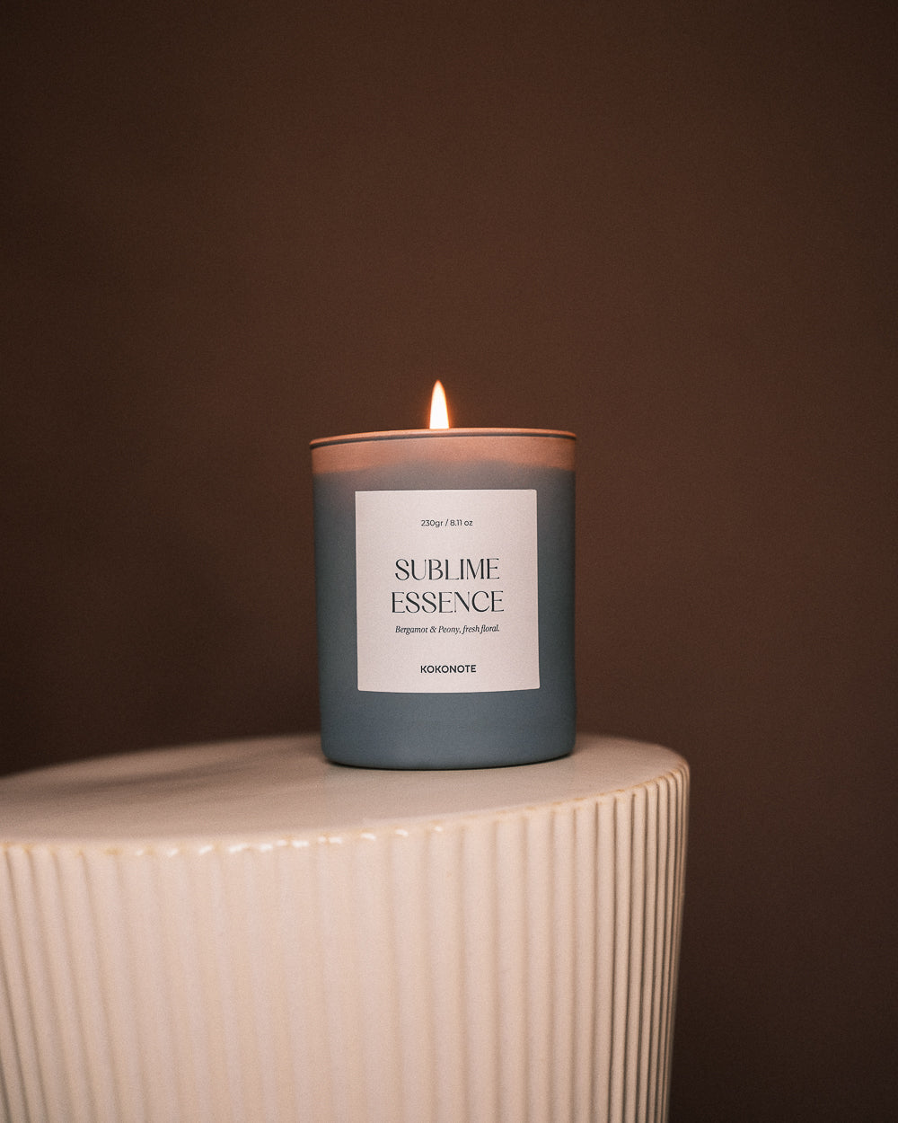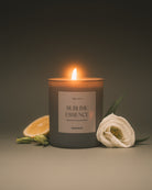 Aromatic candle made with vegetable wax, presented in an elegant cylindrical glass container. This candle, Sublime Essence, evokes a refreshing sensation thanks to its citrus notes, complemented by subtle spicy undertones.