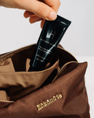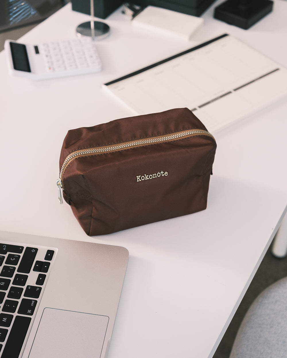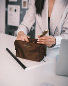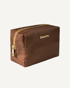 Chocolate brown cosmetic bag with gold details from the Basic Studio collection. With a water repellent finish, a zippered main compartment and an internal pocket, it is the perfect accessory to organize your essentials.