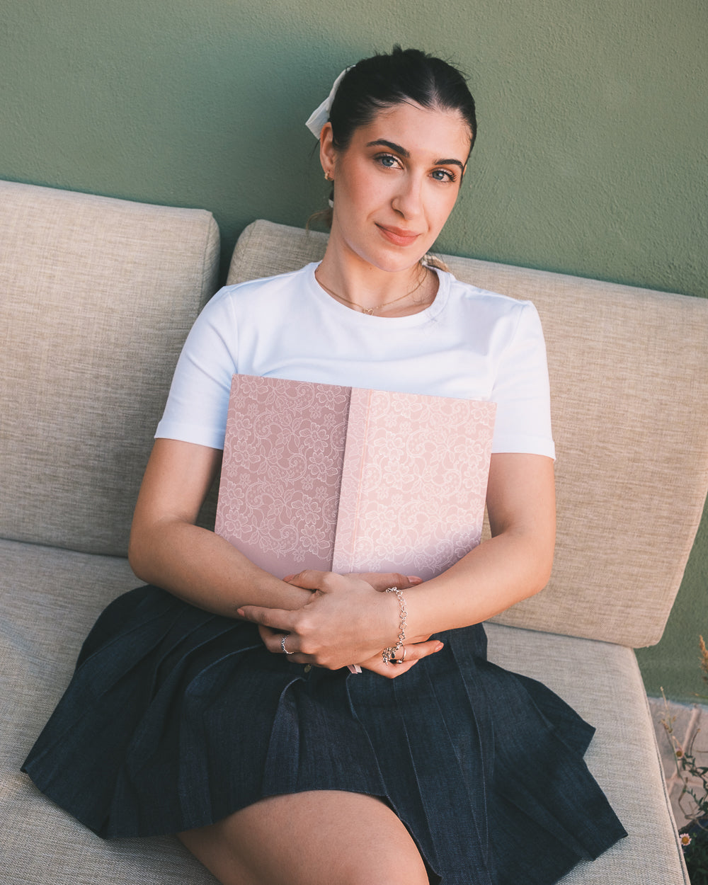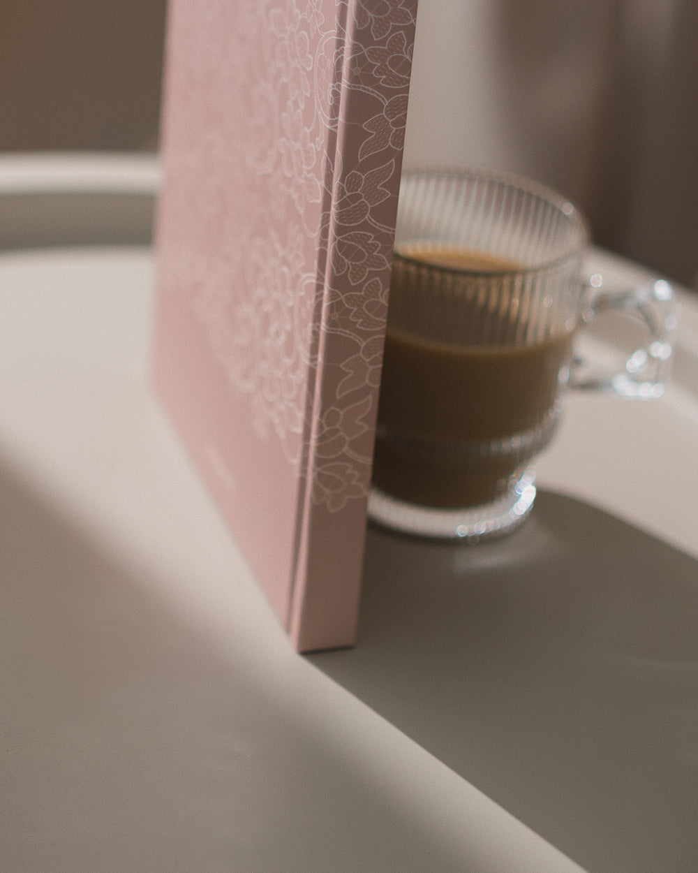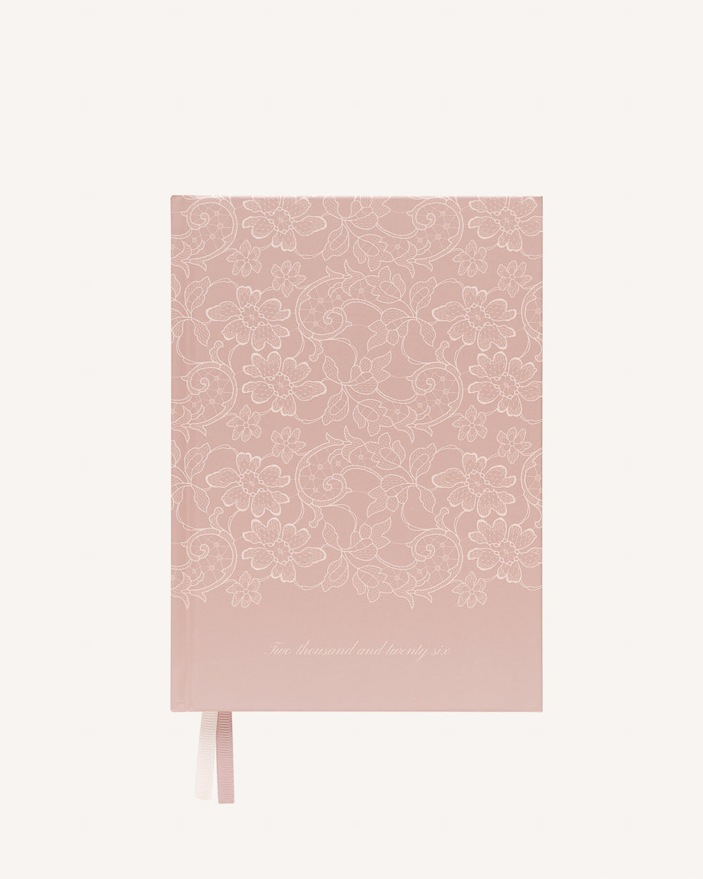 Weekly planner in pink with romantic lace detailing; compact format and coquette style, the ideal accessory for charming planning.