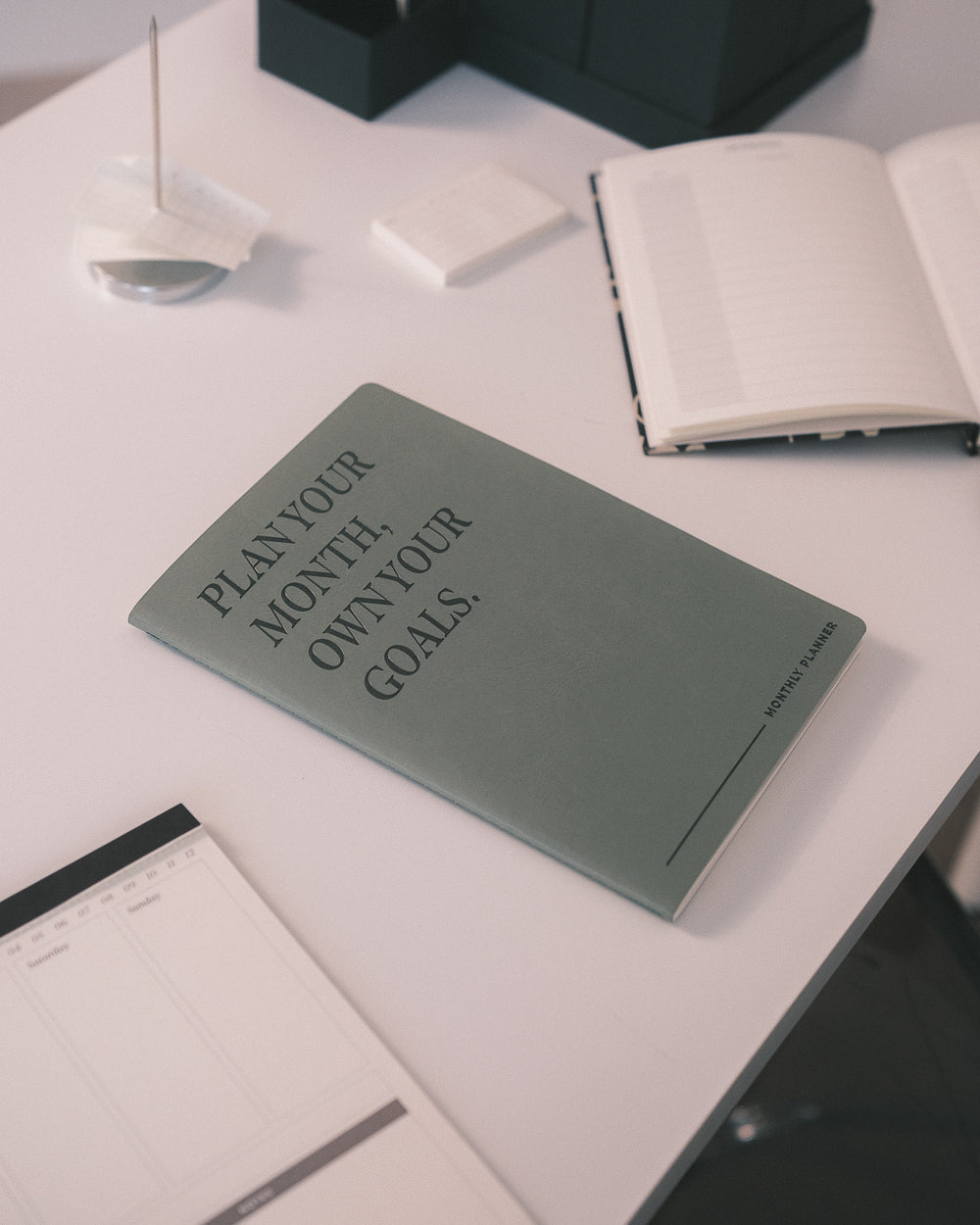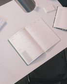 Undated planner in matcha green with golden details. It's your sidekick for 24 months, with space for notes and a soft-touch vegan leather cover. The perfect must-have to complement your planner.