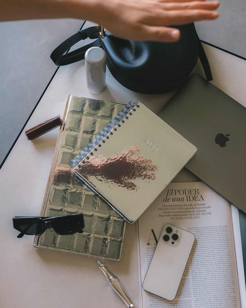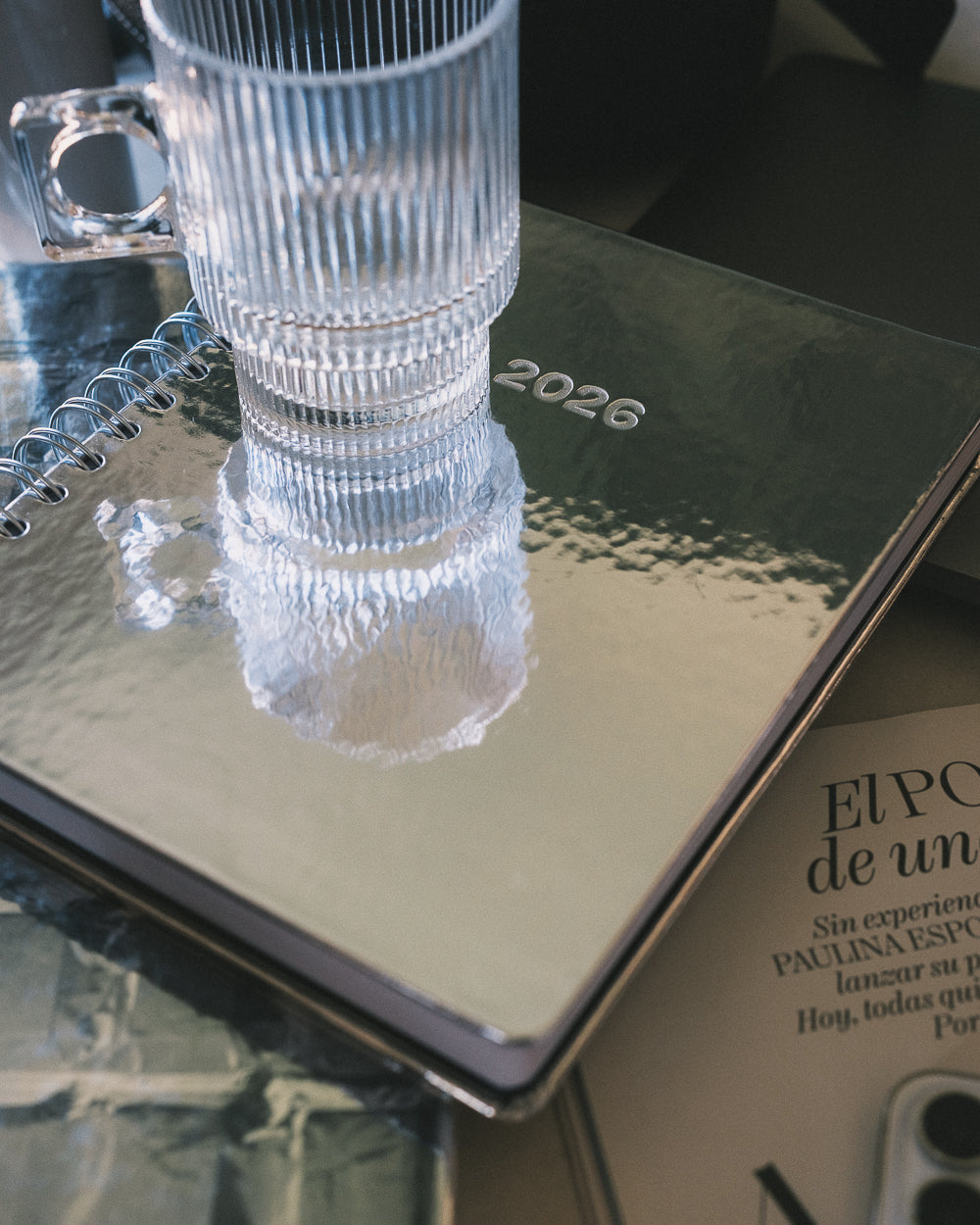Weekly planner with a silver mirror finish; perfect for touching up your lipstick and organizing your chaos on the go.