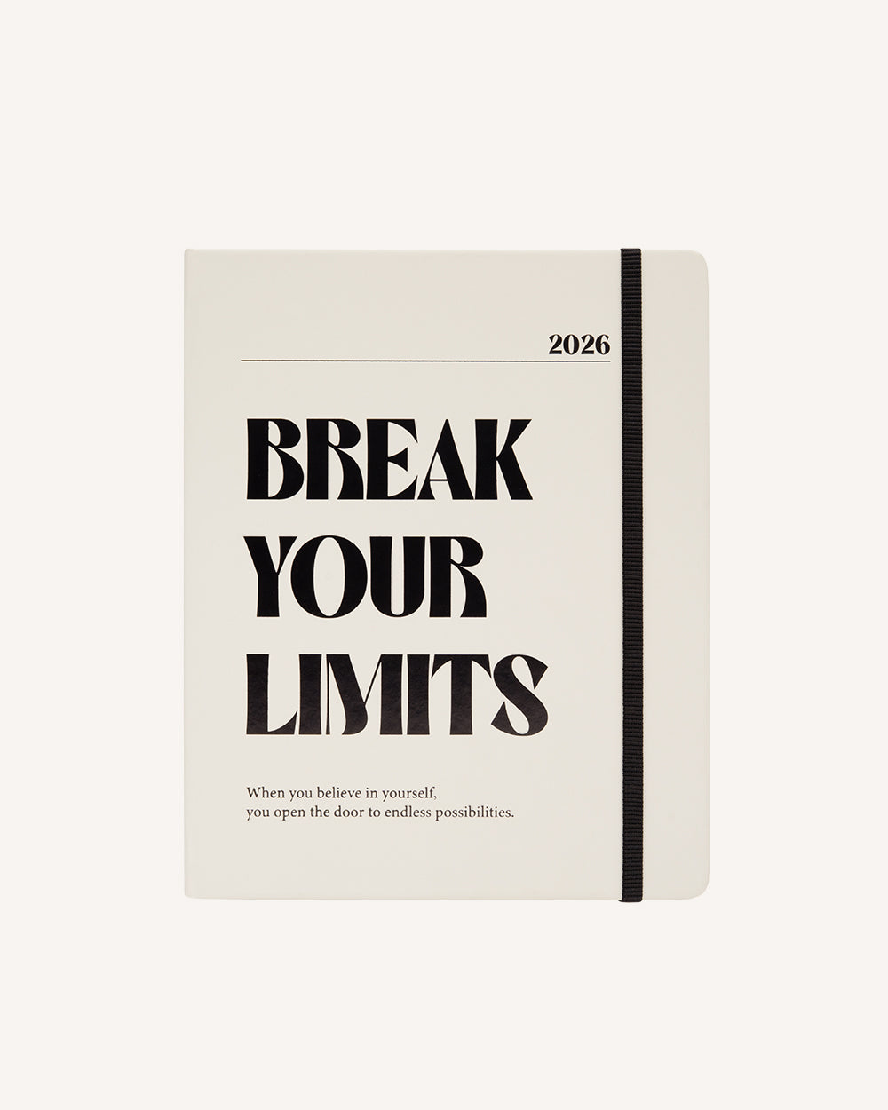 Tu próxima obsesión: agenda minimalista en beige & negro con “Break Your Limits” en portada bold; actitud sin filtros para dominar tu rutina.