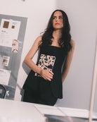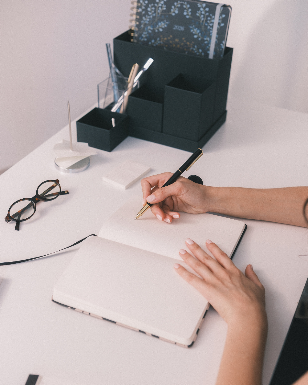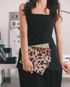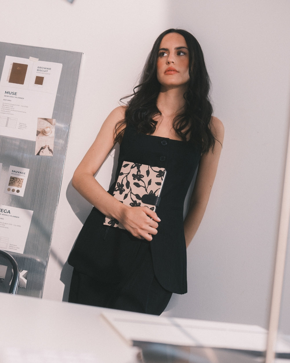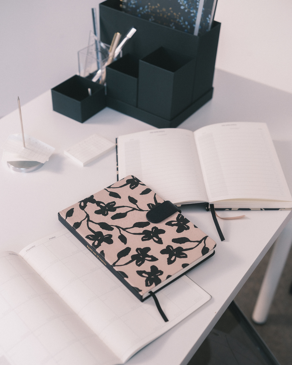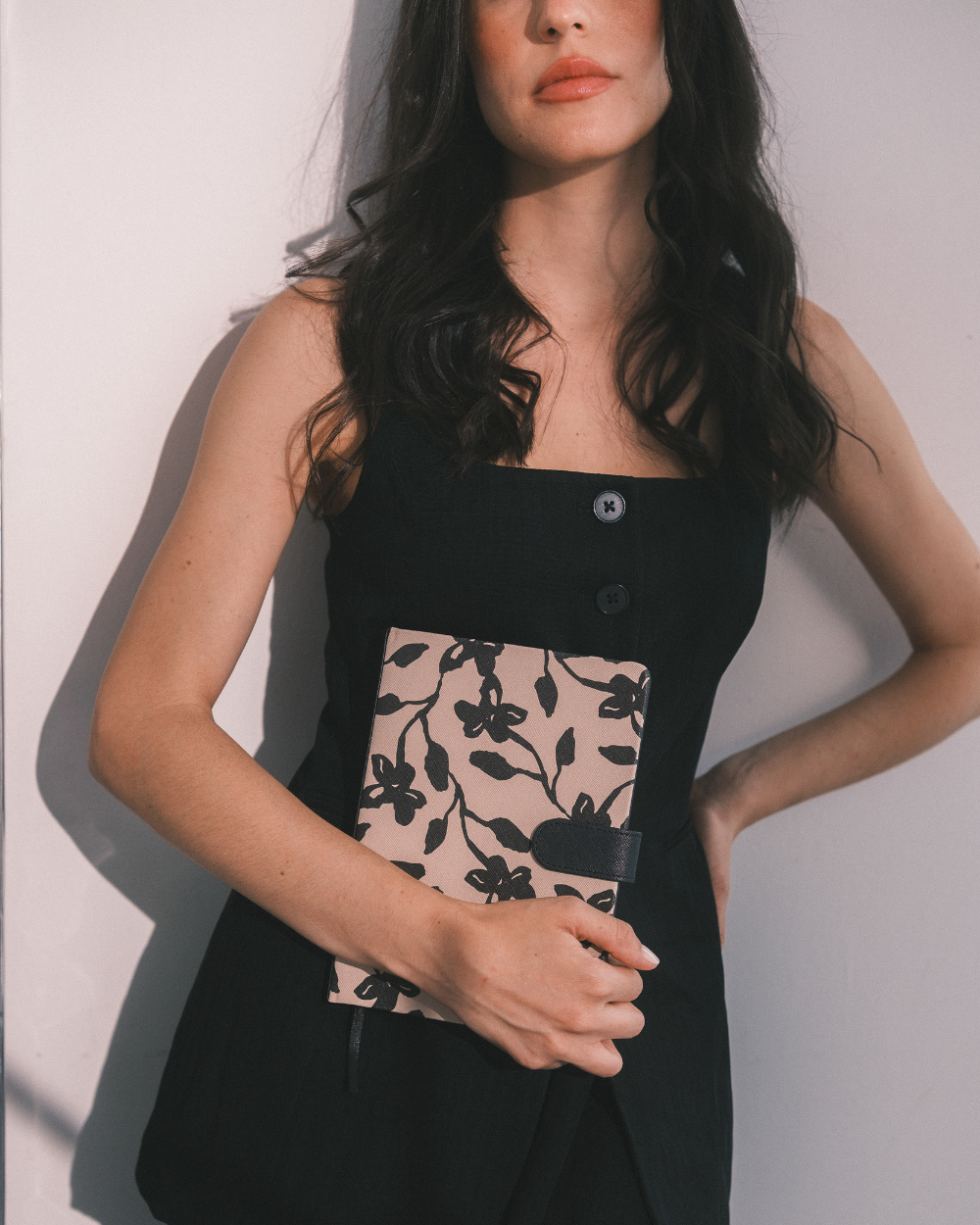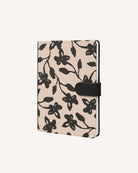Cuaderno elegante con tapa de piel sintética y un exclusivo diseño floral en tonos marrón tierra, con cierre magnético y cinta negra marcapáginas. Su encuadernación permite una escritura cómoda al abrirse completamente y es ideal para organizar tus ideas en cualquier lugar.