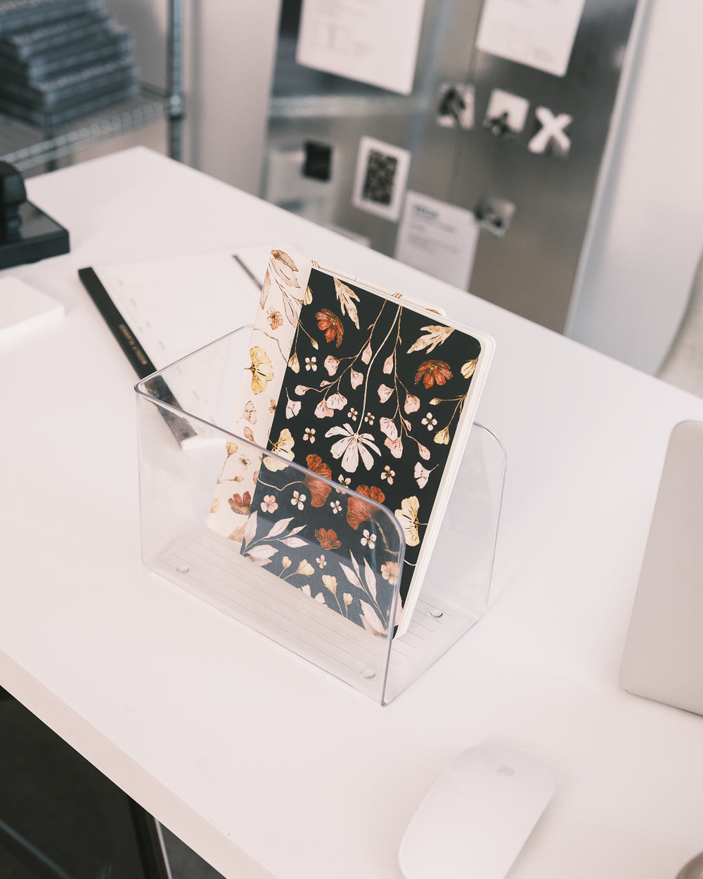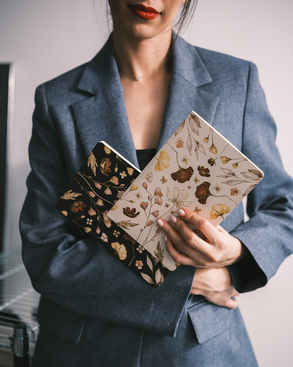 Dos cuadernos con diseño en vainilla suave y negro, decorados con un bouquet de flores pastel que mantiene tu planning en modo bloom.